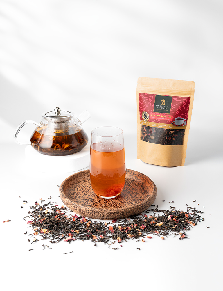 A romantic creation, Singharaja Heritage Premium Cherry Rose Tea blends bold Ceylon black tea with dried cherries, tropical fruits, and rose petals. Hibiscus adds brightness, yielding a ruby-red infusion full of tart sweetness and floral elegance.