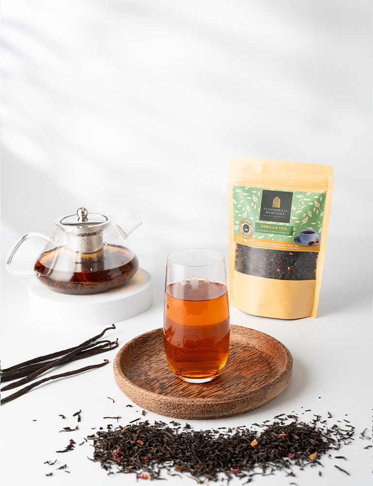 Singharaja Heritage Premium Vanilla Tea is a smooth, comforting blend where bold Ceylon black tea meets the creamy sweetness of natural vanilla. Optional almond or hazelnut undertones and rose petals add depth, creating a rich amber infusion that soothes with every sip.
